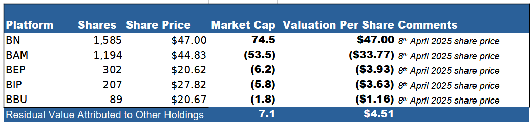That leaves just $4.51 of market-implied value for everything else Brookfield owns - including BWS, carried interest, and various strategic investments.
