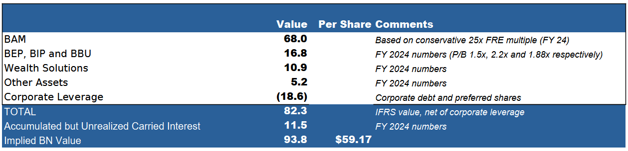 BAM is valued conservatively at 25x fee-related earnings, landing us roughly where the market has it now.